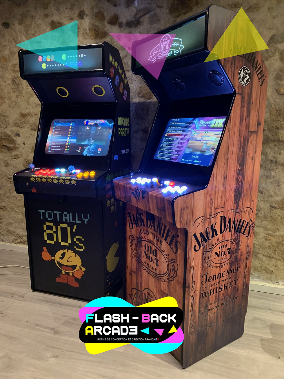 Borne d'Arcade Essentiel comprenant : Console Pandora EX 3D SAGA 8000 jeux avec sauvegarde des parties / Son Logitech 2.1 50Watts avec prise casque en facade / Écran Full HD 24 pouces / Vitre claire de protection écran et marqué 6mm / 1 Joystick et 8 boutons par joueur / Finition T-Molding et grille d'enceinte ( couleur à définir ) H: 178 cm / L: 64 cm / P: 60 cm / +ou - 65 Kg