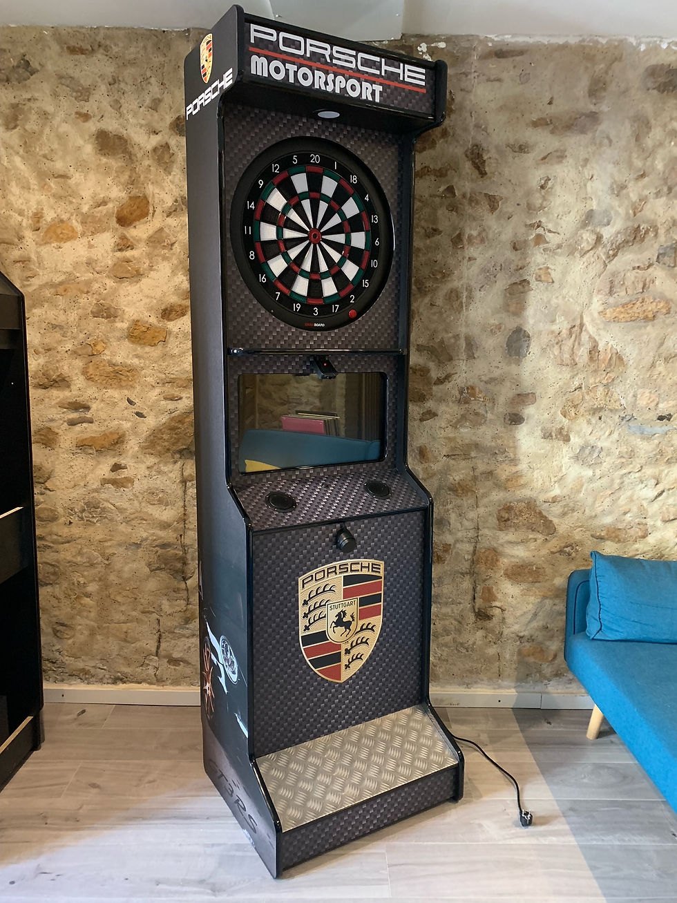 Dartcab Essentiel comprenant : Cible Granboard Dash / Son Logitech 2.1 50Watts / Écran Full HD 24 pouces / Vitre claire de protection écran 6mm / Module Android H96MAX M9 dernière génération ( accès appli GranBoard , YouTube , Google, etc ...) / Éclairage de la cible LED RGB / Finition T-Molding et grille d'enceinte ( couleur à définir )